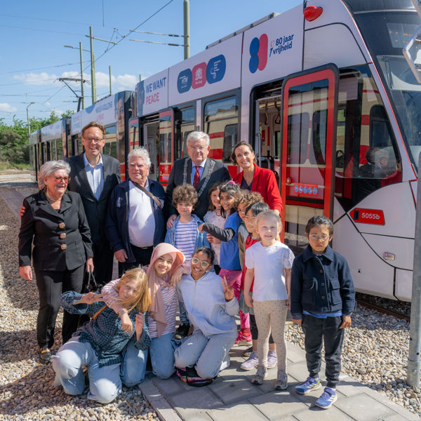 Op donderdag 15 mei heeft burgemeester Jan van Zanen de Vredestram officieel in gebruik genomen. Hij deed dit samen met HTM-directeur Jaap Bierman en initiatiefnemer Henk Grifhorst. Leerlingen van de International Waldorfschool waren ook aanwezig. Sommige van hen staan op de Vredestram afgebeeld en zeggen in hun eigen taal ‘Wij willen vrede!’. Een mooie en belangrijke boodschap nu we dit jaar ook 80 jaar Vrijheid vieren in Nederland.
